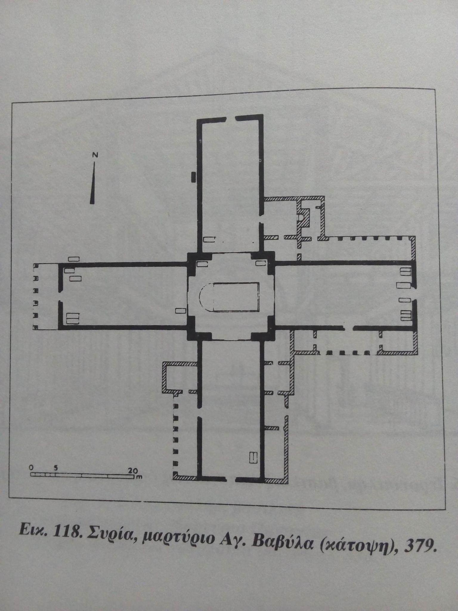 Σημαντικό μνημείο της εποχής αυτής στην Αντιόχεια είναι το σταυρόσχημο μαρτύριο του επισκόπου Βαβύλα. Το μνημείο χτίστηκε από τον επίσκοπο Μελέτιο έξω από την πόλη, για αν στεγάσει τον τάφο του μάρτυρα, τα λείψανα του οποίου μετακομίσθηκαν εκεί από το λιμάνι Δάφνη της Αντιόχειας την εποχή του Ιουλιανού του Αποστάτη. Πρόκειται την παλαιότερη περίπτωση μετακομιδής ιερών λειψάνων. Στο κέντρο υπήρχε ορθογώνιος χώρος, που περιέκλειε τον τάφο του μάρτυρα και καλυπτόταν με πυραμιδοειδή ξύλινη στέγη. Εκεί ήταν και το ιερό Βήμα. Από το σημείο αυτό ξεκινούσαν τέσσερις μονόχωρες αίθουσες που σχημάτιζαν ισοσκελή σταυρό.
