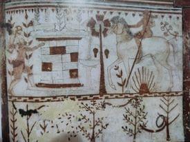 Πρόκειται για τον Τάφο των Ταύρων, όπου εκτός από τις συνηθισμένες διακοσμήσεις, υπάρχει μία σκηνή μεγάλων διαστάσεων με μυθολογικό θέμα. Στα δεξιά είναι ένα άλογο που βαδίζει προς ένα συντριβάνι που αναβλύζει νερό και είναι διακοσμημένο με λιοντάρια. Πίσω από το συντριβάνι είναι μια πολεμοχαρής μορφή και όλη η σκηνή είναι τοποθετημένη σε ένα τοπίο με πλούσια φύση: μπορεί κανείς να διακρίνει διάφορα είδη φυτών και ένα μεγάλο φοίνικα.