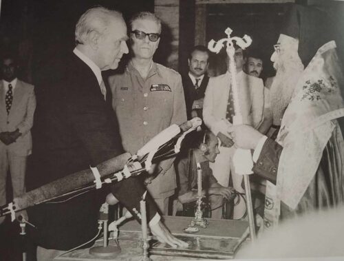 Ο Κωνσταντίνος Καραμανλής ορκίζεται πρωθυπουργός στις 4:00 το πρωί της 24ης Ιουλίου 1974