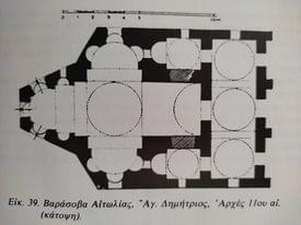 Στον Άγιο Δημήτριο Βαράσοβας το πρόβλημα αντιμετωπίστηκε με την εγγραφή των νεκρών χώρων σε ορθογώνιο, που σχηματίστηκε με την προέκταση προς ανατολάς, μέχρι το σημείο απολήξεως των πλάγιων κογχών του ναού, των στενών πλευρών του νάρθηκα. Με τον τρόπο αυτό προέκυψαν εκατέρωθεν του δυτικού σκέλους του σταυρού δύο παράπλευροι χώροι. Προήλθε έτσι τύπος ναού που μπορεί να ονομαστεί σταυροειδείς ημιεγγεγραμμένος. Ο ναός της Βαράσοβας αποτελεί έναν μεταβατικό τύπο μεταξύ ελεύθερου και εγγεγραμμένου τρίκογχου.