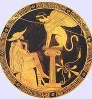 Στη συνέχεια της περιπλάνησης του ο Οιδίπους έφτασε έξω από τη Θήβα. Εκεί υπήρχε ένα φοβερό τέρας, μισό φτερωτό λιοντάρι, μισή γυναίκα, η Σφίγγα, η οποία ρωτούσε: «Τι είναι αυτό που στην αρχή περπατά με τέσσερα πόδια, μετά με δύο και στο τέλος με τρία πόδια;». Κανείς δεν κατάφερε μέχρι τότε να το λύσει και τους ατυχήσανες τους έριχνε σε μια χαράδρα, η οποία είχε γεμίσει με κόκαλα των θυμάτων της. Ο θάνατος του Λάιου οδήγησε τους Θηβαίους να προσφέρουν την εξουσία σε όποιον θα κατάφερνε να λύσει το αίνιγμα και θα απελευθέρωνε την πόλη τους από το φοβερό τέρας. Ο Οιδίπους το έλυσε βρίσκοντας την απάντηση που ήταν «ο άνθρωπος» (περπατά με τέσσερα πόδια όταν είναι μωρό, με δύο όταν μεγαλώνει και με μπαστούνι όταν γερνάει). Η Σφίγγα όταν άκουσε την απάντηση θύμωσε και έπεσε μόνη της στον γκρεμό.
